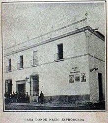 Espronceda was born in Almendralejo, at the Province of Badajoz.[5] As a youth, he studied at the Colegio San Mateo at Madrid, having Alberto Lista as a teacher. When he was 15 years old, he formed a secret society named "Los Numantinos" alongside his friends Ventura de la Vega and Patricio de la Escosura, conspiring against Ferdinand VII and intending to avenge the death of Rafael del Riego. For this, he was imprisoned in a monastery and exiled.[6] Afterward, he left Spain and lived in Lisbon, Belgium, France, England and Holland. On his return to Spain in 1833, he became active in the extreme left-wing of Spanish political culture. Espronceda is also known for his affair with Teresa Mancha, for whom he wrote "Canto a Teresa" (from El diablo mundo). He died of diphtheria in 1842.