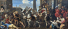 In addition to honoring him, there was a strong tendency in the patristic period to view his life as a typological precursor to Christ.[68] This tendency is represented in John Chrysostom who said that Joseph's suffering was "a type of things to come",[69] Caesarius of Arles who interpreted Joseph's famous coat as representative of the diverse nations who would follow Christ,[70] Ambrose of Milan who interpreted the standing sheaf as prefiguring the resurrection of Christ,[71] and others.