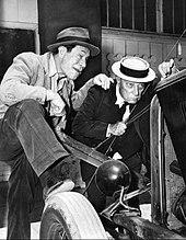 On April 3, 1957, Keaton was surprised by Ralph Edwards for the weekly NBC program This Is Your Life. The program also promoted the release of the biographical film The Buster Keaton Story with Donald O'Connor.[39] In December 1958, Keaton was a guest star in the episode "A Very Merry Christmas" of The Donna Reed Show on ABC. He returned to the program in 1965 in the episode "Now You See It, Now You Don't".[40] In August 1960, Keaton played mute King Sextimus the Silent in the national touring company of the Broadway musical Once Upon A Mattress.[41] In 1960, he returned to MGM for the final time, playing a lion tamer in a 1960 adaptation of Mark Twain's The Adventures of Huckleberry Finn. Much of the film was shot on location on the Sacramento River, which doubled for the Mississippi River setting of Twain's book.[42] In 1961, he starred in The Twilight Zone episode "Once Upon a Time", which included both silent and sound sequences. He worked with comedian Ernie Kovacs on a television pilot tentatively titled "Medicine Man," shooting scenes for it on January 12, 1962—the day before Kovacs died in a car crash. "Medicine Man" was completed but not aired.[43]