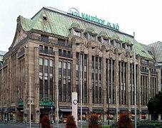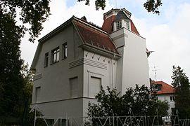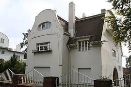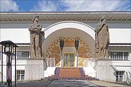 In 1897, Gustav Klimt, Olbrich, Josef Hoffmann and Koloman Moser founded the Vienna Secession artistic group. Olbrich designed their exhibition building, the famous Secession Hall, which became the movement's landmark.[2] In 1899, Ernest Louis, Grand Duke of Hesse, founded the Darmstadt Artists' Colony, for which Olbrich designed many houses (including his own) and several exhibition buildings. Olbrich gained Hessian citizenship in 1900 and was appointed to a professorship by the Grand Duke. In 1903, he married Claire Morawe.[3]