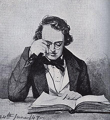 Severn is best known for his many portraits of Keats, the most famous being the miniature portrait in the National Gallery (1819), the pen-and-ink sketch, Keats on his Deathbed (1821), and the oil painting of the poet reading, John Keats at Wentworth Place (1821–23). A later painting, Keats, at Hampstead, when he first imagined his Ode to a Nightingale (1851), is also notable. In the 1860s Severn produced a number of copies and memory portraits as Keats's reputation continued to grow. The most influential of Severn's early Italian genre paintings are The Vintage, commissioned by the Duke of Bedford in 1825, and The Fountain (Royal Palace, Brussels) commissioned by Leopold I of Belgium in 1826. The latter picture likely influenced J. M. W. Turner's major work, The View of Orvieto.[16] One of his most remarkably inventive works is the Rime of the Ancient Mariner (1839) based on Samuel Coleridge's famous poem, which recently sold at Sotheby's for £32,400. Another historical subject, The Abdication of Mary, Queen of Scots, sold for £115,250 at Sotheby's Gleneagles sale on 26 August 2008.[17]