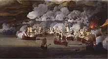 In April 1667 La Barre's ship Armes d’Angleterre engaged in a desperate battle with the English ship Colchester.[1] The Armes d'Angleterre with 24 guns and a crew of 110 defeated the larger Colchester with 44 guns and 300 men in an engagement off the point of Nevis.[22] La Barre was wounded and returned to Martinique.[1] The Dutch commander Abraham Crijnssen heard that an English squadron commanded by Sir John Berry had entered the Caribbean, and sailed to Martinique to discuss plans with the French. La Barre proposed joint action against the English, which became more urgent when word arrived that Saint Christopher Island was being blockaded by Berry.[18] La Barre and the governor of Martinique, Robert de Clodoré combined their forces with Crijnssen.[1] The Franco-Dutch fleet sailed for Nevis, and engaged the English in the Battle of Nevis (20 May 1667).[18] La Barre caused a retreat through his incompetence, and Crijnssen left for Virginia in disgust. [18]