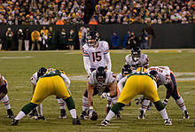 On November 23, 2011, McCown signed with the Chicago Bears, as a backup to Caleb Hanie, after an injury to starting quarterback Jay Cutler.[155][156] On December 18, 2011, McCown came in for Hanie with five minutes left in the fourth quarter of a 38–14 loss to the Seattle Seahawks at Soldier Field. McCown threw twice, one of his throws for a 12-yard gain, and the other was intercepted.[157][158] On December 21, 2011, the Bears announced that McCown would start on the Christmas Day game against the defending champion Green Bay Packers, due to Hanie's struggles since taking over for the injured Cutler.[159][160] McCown completed 19-of-28 passes for 242 yards with a touchdown and two interceptions in the 35–21 loss.[56] In Week 17 against the Minnesota Vikings, McCown completed 15-of-20 passes for 160 yards with a touchdown and a pick with a 75.4 passer rating, but was sacked seven times. The Bears won 17–13.[56]