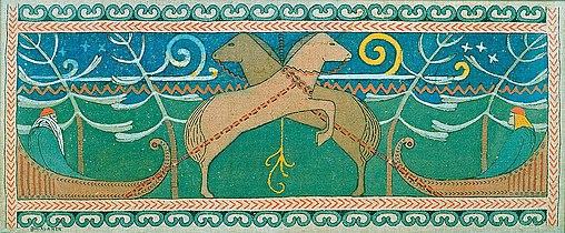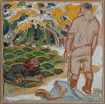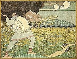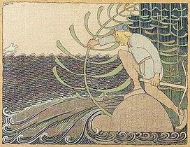 After clashing with their horses and challenging Väinämöinen to a fight, they engage in a battle of song. He loses and is magically sung into being swallowed by a mire. In his plea for help from Väinämöinen, he pledges his sister Aino to him. But she objects to Väinämöinen, and rather than marrying him she drowns herself. Joukahainen is enraged by all that has taken place and even though his mother tries to stop him, he ambushes Väinämöinen with his crossbow. Joukahainen misses Väinämöinen but hits and kills his horse from under him, making him plunge into the icy waters of Pohjola.[1][2][3][4]
