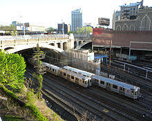 The bridge carrying the boulevard was designed by consulting engineer Abraham Burton Cohen and completed in 1926.[6] For most of the twentieth century Journal Square was the cultural entertainment center of Hudson County,[7] home to the movies palaces built in the 1920s: The State (1922, and since demolished),[8] the Stanley Theater (1928),[9] and the Loew's Jersey Theater (1929).[10] Karen Angel of The New York Daily News described Journal Square from the 1920s to the 1960s as "crown jewel, a glowing commercial, entertainment and transportation hub of the city."[11] The "Jersey Bounce", a hit song in the 1940s mentions Journal Square in its lyrics as the place where it got started. Two days before Election Day in 1960 John F. Kennedy made his last campaign speech before returning to New England at Journal Square.[12] Hudson Boulevard was named Kennedy Boulevard soon after his assassination. The Tube Bar, so-called for the Hudson Tubes (as the fore-runner of the PATH system was called) was made famous by Louis "Red" Deutsch getting prank calls there.[13]