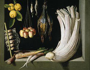 Norman Bryson describes Sánchez Cotán’s spare representations as abstemious images and links his work to his later monastic life.[1] They are supposed to express a monastic denial of worldly pleasure and richness: "Absent from Cotán's work is any conception of nourishment as involving the conviviality of the meal .... What replaces their interest as sustenance is their interest as mathematical form."[1] His fruits and vegetables are arranged in beautiful ballet like compositions. The Carthusians are vegetarian, but many of his works contain game birds.