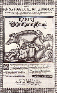 In Vom Schem Hamphoras (1543), Luther comments on the Judensau sculpture at Wittenberg, echoing the antisemitism of the image and locating the Talmud in the sow's bowels: