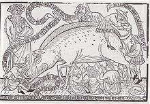 A Judensau (German for "Jews' sow"[1])[2][3] is a folk art[4] image of Jews in obscene contact with a large sow (female pig), which in Judaism is an unclean animal, that appeared during the 13th century in Germany[1] and some other European countries; its popularity lasted for over 600 years.[5]