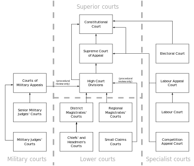 Chapter 8 of the Constitution of South Africa defines the structure of the South African judicial system.[2] This chapter also guarantees the independence of the courts and requires other organs of the state to assist and protect the courts in order to ensure their "independence, impartiality, dignity, accessibility and effectiveness". In addition, Chapter 2 of the Constitution guarantees every person the right to have a dispute or trial heard by a fair, impartial and independent court.