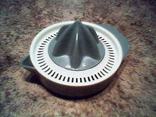 Squeezers are used for squeezing juice from citrus such as grapefruits, lemons, limes, and oranges.[4] Juice is extracted by pressing or grinding a halved citrus along a juicer's ridged conical center and discarding the rind. Some reamers are stationary and require a user to press and turn the fruit, while others are electrical, automatically turning the ridged center when fruit is pressed upon.