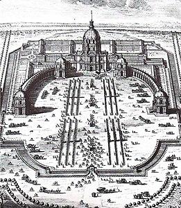 On March 1, 1676, François-Michel le Tellier, Marquis de Louvois, the Minister of War, summoned Hardouin-Mansart to take over construction of Les Invalides, the enormous hospital and chapel the King was building in the center of Paris for his pensioned and wounded soldiers. The project had been begun in 1671 by Libéral Bruant, and some of the residential buildings were completed and already occupied, but the centerpiece, the chapel for the soldiers, had not been begun. The King was not satisfied with the plans that were offered to him by Bruant, and complained about the slowness of the work. On March 1, 1676, Louvois dismissed Bruant and summoned Hardouin-Mansart, who was little known outside the royal household, and asked him to take over the church. [5]