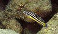 These ray-finned fish are smallish to mid-sized (about 7–15 centimetres or 2.8–5.9 inches) and have a yellowish background colour with black lengthwise stripes or a checkerboard pattern.