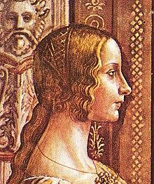 Fresco portrait of the teenage Ludovica Tornabuoni, late 1480s. Stretchy bias criss-cross between stiffer bands running from ear to ear