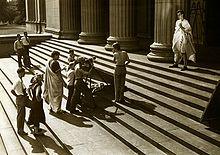 The 16 mm film was shot in 1949 on several locations around the Chicago area, including Soldier Field, the Museum of Science and Industry, the Field Museum, the downtown post office, and the Elks National Veterans Memorial.[3] The Indiana sand dunes on Lake Michigan were used for the Battle of Philippi.[4] One indoor set was built in the Chicago suburb of Evanston. To save money, around 80% of the film was shot silently, with the dialogue dubbed in later by the actors.