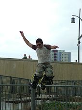 The act of "bocking" or "powerbocking" includes jumping, running, and performing acrobatics with elastic-like spring-loaded stilts.[2] They can be used to jump great distances and allow the user to bounce over people and cars and to perform backflips.[3] For some, it is an extreme sport; for others, it is a form of exercise, artistic expression and a form of entertainment.