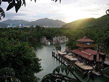 When plans began to develop, Bill Evans, the Imagineer responsible for landscaping Disneyland and most of Walt Disney World, faced the daunting task of creating a convincing jungle on a limited budget.[4] Aside from importing many actual tropical plants, he made wide use of "character plants" which, while not necessarily exotic, could give the appearance of exoticism in context. In a particularly well-known trick, he uprooted local orange trees and "replanted" them upside-down, growing vines on the exposed roots.[5][6] Disney controls the clarity of the water (known as "turbidity") in order to obscure from guests' view the boat's guidance system and undesirable items like perches and mechanized platforms of the bathing elephants and hippos. Initially, the clean water was dyed brown but after a few years the colorant was changed to a green hue and in recent years a bluish-green has been used.[4] The water of the Jungle Cruise is approximately 5 feet deep and is part of the park's 'dark' water system which circulates southward from the northern end of Frontierland's Rivers of America, through Fantasyland and creates the moat of Storybook Land Canal Boats and Sleeping Beauty Castle. The water's journey continues flowing past Frontierland's entrance and into Adventureland where it meanders alongside the Tiki Room before entering the Jungle Cruise beside the ride's exit. The water returns to the south end of the Rivers of America via a 37" diameter underground pipe near Tarzan's Treehouse. Originally, the Jungle Cruise waterway was 1,920 feet in length before being slightly shortened and re-routed in 1994.