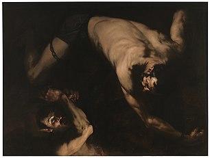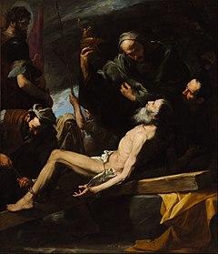 Ribera's work remained in fashion after his death, largely through the hyper-naturalistic depictions of cruel subjects in the paintings of such pupils as Luca Giordano.[10] According to the 1911 11th edition of Encyclopædia Britannica "His forms, though ordinary and partly gross, are correct; the impression of his works gloomy and startling. He delighted in subjects of horror."[11] He painted the horrors and reality of human cruelty and showed he valued truth over idealism. The gradual rehabilitation of his international reputation was aided by exhibitions in Princeton in 1973, of his prints and drawings, and of works in all media in London at the Royal Academy in 1982 and in New York at the Metropolitan Museum of Art in 1992. Since then his oeuvre has gained more attention from critics and scholars. Unfortunately, due to the ebb of interest in his work for so long, a complete catalogue raisonné of his work is still lacking. Many works attributed to him have been altered, discarded, damaged, and neglected during his period of obscurity.[10]
