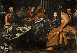 His early biographers generally rank him among the followers of Caravaggio.[5] Very little documentation survives from his early years, with scholars speculating as to the precise time and route by which he came to Italy. Ribera started living in Rome no later than 1612, and is documented as having joined the Academy of Saint Luke by 1613.[5] He lived for a time in the Via Margutta, and almost certainly associated with other Caravaggisti who flocked to Rome at that time, such as Gerrit van Honthorst and Hendrick ter Brugghen, among other Utrecht painters active in Rome by 1615. In 1616, Ribera moved to Naples, in order to avoid his creditors (according to Giulio Mancini, who described him as living beyond his means despite a high income). In November, 1616, Ribera married Caterina Azzolino, the daughter of a Sicilian-born Neapolitan painter, Giovanni Bernardino Azzolino, whose connections in the Neapolitan art world helped to establish Ribera early on as a major figure, whose presence was to bear a lasting impact on the art of the city.[5]