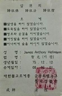 In South Korea, the ritual, called sugye (수계), involves formally taking refuge in The Three Jewels of Buddhism: the Buddha, the Dharma, and the Sangha, and accepting the five precepts. During the ritual, the initiate is touched with a burning incense stick. This is to leave a permanent mark which serves to remind the initiate of their promise to uphold the five precepts. During (or right after) the ceremony, the initiate is given a Buddhist name.[4]