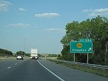 K-114 is a 0.9-mile-long (1.4 km) spur route that serves the city of Ogden in southwestern Riley County.[40] The highway begins at the east city limit of Ogden; the road continues southwest as Riley Street. The highway curves southeast as a four-lane divided highway, crosses a Union Pacific rail line, and reaches its eastern terminus at a partial cloverleaf interchange with K-18, a four-lane freeway that heads northeast toward Manhattan and southwest toward I-70 and Junction City.[40][41][2] K-114 was proposed as part of a May 9, 1973, Kansas State Highway Commission resolution to remove K-18 from its course through Fort Riley in favor of a route around the military base between Ogden and Junction City to separate military traffic and regular highway traffic. K-18 would be placed on its present corridor from just east of Ogden south to I-70, and the piece of K-18 between the city of Ogden and the new portion of K-18 would become K-114.[42] The junction of K-18 and K-114 would be a partial interchange featuring a flyover ramp for westbound K-18 and no access from K-114 to westbound K-18 or from eastbound K-18 to K-114.[41][42] K-114 was established when construction on the K-18 link between Ogden and I-70 was completed between 1975 and 1977.[43][44] Between 2010 and 2013, K-18 and K-114 were relocated and their present interchange was constructed.[45][46]