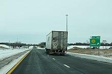 K-253 is a 0.674-mile-long (1.085 km) spur route that serves the unincorporated village of Edson in east central Sherman County.[1][2] The highway begins at a diamond interchange with I-70 and US-24, which run concurrently east–west, between Goodland and Brewster. K-253 heads north to Old U.S. Highway 24, where the highway ends east of the center of Edson.[2] The Kansas State Highway Commission established K-253 to retain state highway access to Edson in an August 10, 1966, resolution.[179] This access was not originally part of plans for the portion of I-70 between the Colorado state line and Levant in Thomas County, as US-24 would have been moved onto I-70 and the old course of US-24 would be removed from the state highway system; these plans had been approved in a June 7, 1966, resolution.[180] K-253 was marked after I-70 was completed from Goodland to Levant in 1968.[181][98]