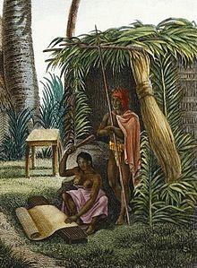Each kapa manufacturer used an ʻiʻe kūkū, a beater with four flat sides that were each carved differently. Another way to carve the kapa is by starting on the four-sided affairs, with the coarsest grooves on one side used first in breaking down the bast, or wet bark. Then, the beating continued using two sides with finer grooves. Lastly, finishing touches were accomplished with the remaining smooth side of the beater.[9] The carvings left an impression in the cloth that was hers alone. After the European discovery of the Hawaiian Islands, Western traders travelled to Hawaiʻi especially for kapa.