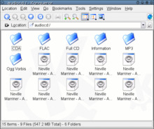 Similarly, Konqueror can use KIO plugins (called IOslaves) to access ZIP files and other archives, to process ed2k links (edonkey/emule), or even to browse audio CDs, ("audiocd:/") and rip them via drag-and-drop. Likewise, the "man:" and "info:" IOslaves can be used to fetch man and info formatted documentation.