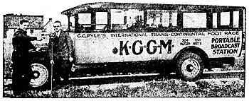 In early 1928, promoter C. C. Pyle organized a cross-country foot race divided into daily timed stages and run from Los Angeles to New York City.[4] H. C. Shaw hired the KGGM equipment, carried on a specially prepared school bus,[3] and used it to make broadcasts from the various race destinations. In late March the race was scheduled to end a leg in Albuquerque, and the station was set up to broadcast the runners' arrivals followed by their departures the following day.[5] However, a financial dispute led to the race bypassing the city, although the station continued to shadow the racers as they headed east. On May 10, a front page article announced that the racers and KGGM had arrived in Elyria, Ohio, where the station was used to make a broadcast featuring Congressional Representative James T. Begg.[6]