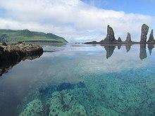 Kagamil Island (Aleut: Qagaamila;[1] Russian: Кагамил), in the Islands of Four Mountains subgroup of the Aleutian archipelago, is 3.7 miles (6.0 km) north of Chuginadak Island and 1.2 miles (1.9 km) south of Uliaga Island. It is 6.2 miles (10.0 km) in length and up to 3.1 miles (5.0 km) in width. The southern half of the island is dominated by the Kagamil Volcano, which has two summits: one is 2,930 feet (890 m) above sea level, while the other is lower at 2,260 feet (690 m).