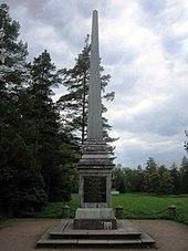 The Kagul Obelisk in Tsarskoye Selo is one of several such structures erected on behest of Catherine II of Russia in 1772 to commemorate Pyotr Rumyantsev's victory in the Battle of Kagul. Designed by Antonio Rinaldi, the dark grey-and-red marble obelisk stands in the landscape park of the Catherine Palace.