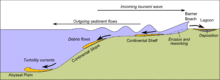The Kaikōura Canyon is a submarine canyon located southwest of the Kaikōura Peninsula off the northeastern coast of the South Island. It is 60 km long, up to 1200 m deep, and is generally U-shaped. It is an active canyon that merges into a deep ocean channel system that meanders for hundreds of kilometres across the deep ocean floor.[6] It is the main sediment source of the 1500 km long Hikurangi Channel, which supplies turbidites to the Hikurangi Trough, as well as to low parts of the oceanic Hikurangi Plateau, and to the edge of the southwest Pacific Basin. It is deeply incised into the narrow, tectonically active, continental margin. It is thought to be the sink for the coastal sediment transport system that carries large amounts of erosional debris northwards up the coast from the rivers draining the tectonically active mountains of the South Island.[7]