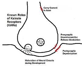 - ^ a b Huettner JE (August 2003). "Kainate receptors and synaptic transmission". Progress in Neurobiology. 70 (5): 387–407. doi:10.1016/S0301-0082(03)00122-9. PMID 14511698.