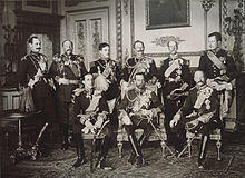 Wilhelm's most contentious relationships were with his British relations. He craved the acceptance of his grandmother, Queen Victoria, and of the rest of her family.[28] Despite the fact that his grandmother treated him with courtesy and tact, his other relatives found him arrogant and obnoxious, and they largely denied him acceptance.[29] He had an especially bad relationship with his Uncle Bertie, the Prince of Wales (later King Edward VII). Between 1888 and 1901 Wilhelm resented his uncle, himself a mere heir to the British throne, treating Wilhelm not as Emperor of Germany, but merely as another nephew.[30] In turn, Wilhelm often snubbed his uncle, whom he referred to as "the old peacock" and lorded his position as emperor over him.[31] Beginning in the 1890s, Wilhelm made visits to England for Cowes Week on the Isle of Wight and often competed against his uncle in the yacht races. Edward's wife, the Danish-born Alexandra, first as Princess of Wales and later as Queen, also disliked Wilhelm, never forgetting the Prussian seizure of Schleswig-Holstein from Denmark in the 1860s, as well as being annoyed over Wilhelm's treatment of his mother.[32] Despite his poor relations with his English relatives, when he received news that Queen Victoria was dying at Osborne House in January 1901, Wilhelm travelled to England and was at her bedside when she died, and he remained for the funeral. He also was present at the funeral of King Edward VII in 1910.