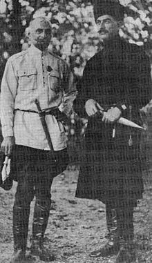 With the outbreak of World War I in 1914, Cholokashvili was recalled to active duty and assigned to lead a cavalry squadron on the Austro-Hungarian front. Wounded later that year, he was transferred to the Caucasus Front. During the Battle of Sarikamish in December 1914, he commanded a cavalry squadron under General Vasily Gabashvili and distinguished himself by capturing and defending a strategic fortification known as "the Eagle's Nest" against the overwhelming Ottoman troops. He was severely wounded and awarded the Gold Sword for Bravery in 1916. After treatment at the St. Nino Hospital in Tiflis, he was enlisted in the nascent Georgian Cavalry Legion which marched into Persia as part of General Baratov's 1915–1917 expedition.[3] Shortly thereafter, he was promoted to the rank of podpolkovnik (lieutenant-colonel).[4]
