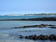 Kaloko (meaning "the pond" in the Hawaiian language)[4] is a site of fishponds used in ancient Hawaii is on the North end of the park. The first reference to the pond comes from the story of Kamalalawalu, about 300 years ago. The kuapā (seawall)[5] is over 30 feet wide and 6 feet high, stretching for 750 feet. Constructed by hand without mortar, the angle and gaps between the stones deflected the surf better than many modern concrete seawalls.[6]