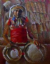 The dancers wear an elaborate costume including a headdress. The dancer's chest is only covered by a decorative beaded net. This costume is known as the Ves costume. The headdress incorporates a metallic front which makes the dancer look taller than he is. The complete costume also includes anklets that produce a metallic rattle each