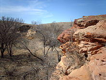 Kansas (/ˈkænzəs/ ) is a state in the center of the United States.[10] Its capital is Topeka and its largest city is Wichita.[11] Kansas is bordered by Nebraska to the north; Missouri to the east; Oklahoma to the south; and Colorado to the west. Kansas is named after the Kansas River, which in turn was named after the Kansa Native Americans who lived along its banks.[12][13][14][15] The tribe's name (natively kką:ze) is often said to mean "people of the (south) wind" although this was probably not the term's original meaning.[16][17] For thousands of years, what is now Kansas was home to numerous and diverse Native American tribes. Tribes in the eastern part of the state generally lived in villages along the river valleys. Tribes in the western part of the state were semi-nomadic and hunted large herds of bison.