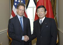 In the leadership election, held on September 22, 2008, Tarō Asō was elected with 351 of the 527 votes, while Yosano trailed in second place with 66 votes.[5] In Aso's Cabinet, appointed on 24 September 2008, Yosano retained his post as Minister of Economic and Fiscal Policy.[6] On February 18, 2009, With the resignation of Shoichi Nakagawa on the case of the G7 conference, he took office as Minister of Finance and Minister in charge of financial services.