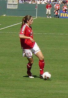Kara Elise Lang (born 22 October 1986) is a Canadian soccer player and sports analyst, who represented her country in two FIFA World Cups and the Olympic Games, and played club soccer for Vancouver Whitecaps Women. She is the youngest woman to be named to Canada National Women's Team, making her National Team debut on 1 March 2002 at the Algarve Cup in Portugal at age 15.[1] Lang retired on 5 January 2011 at the age of 24 due to recurring knee and ACL injuries.[1] Lang began a comeback in 2013, with her ambition being to help Canada in the 2015 FIFA Women's World Cup, but suffered a third ACL injury in February 2014, effectively ending her comeback. She now has two sons with professional baseball player Ricky Romero.[2][3] She was inducted into the Canadian Soccer Hall of Fame as a player in November 2015.[4]