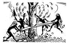 It is believed that kallikantzaroi stay underground, sawing the world tree so that it will collapse, along with the Earth.[1] However, according to folklore, when they are about to saw the final part, Christmas dawns and they are able to come to the surface. They forget the tree and come to bring trouble to mortals.