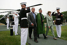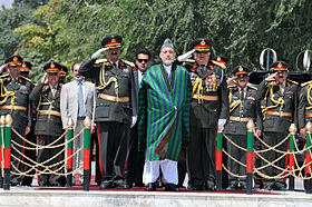 Many people have plotted to assassinate Karzai in the last decade, especially the Taliban's Quetta Shura and the Taliban-allied Haqqani network which allegedly receives support and guidance from Pakistan's Inter-Services Intelligence (ISI) spy network.[79][80] As recent as October 2011, while Karzai was visiting India to sign an important strategic partnership agreement with Indian Prime Minister Manmohan Singh, Afghan agents of the National Directorate of Security (NDS) arrested 6 people in Kabul for planning to assassinate Karzai. Among those involved in the assassination plot were four Kabul University students and one of its professors, Dr. Aimal Habib, as well as Mohibullah Ahmadi who was one of the guards outside the Presidential Palace in Kabul.[81] The alleged group of assassins were associates of al Qaida and the Haqqani network, and were paid $150,000 by Pakistani-based Islamic terrorists.[82][83][84] A U.S. official said that "Our understanding is that the threat against President Karzai was real, was credible, but it was only in the early stages of planning."[85] The following is a list of other failed assassination attempts:
