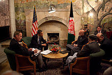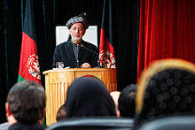 In December 2009 Karzai announced to move ahead with a Loya Jirga (large assembly) to discuss the Taliban insurgency in which the Taliban representatives would be invited to take part in this Jirga.[49] In January 2010, Karzai set the framework for dialogue with Taliban leaders when he called on the group's leadership to take part in the jirga to initiate peace talks. A Taliban spokesman declined to talk in detail about Karzai's offer and only said the militants would make a decision soon.[50] In April 2010, Karzai urged Taliban insurgents to lay down their arms and air their grievances while visiting a violent northern province, adding that foreign forces would not leave the country as long as fighting continued.[51] In July 2010, Karzai approved a plan intended to win over Taliban foot soldiers and low-level commanders.[52] In mid-August 2013, Attorney General Mohammad Ishaq Aloko was said to have been fired after meeting with Taliban officials in the U.A.E. after being told not to meet with them. However, unnamed senior cabinet officials tried to persuade Karzai to not fire him, while an official in Aloko's office denied the dismissal saying instead that he was at the Presidential Palace "celebrating Independence Day."[53]