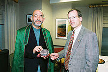 Born in Kandahar, Karzai graduated from Kabul's Habibia High School and later received a master's degree in India in the 1980s. He moved to Pakistan where he was an active as a fundraiser for the mujahideen during the Soviet–Afghan War (1979–1989) and its aftermath. He briefly served as Deputy Foreign Minister in the Islamic State of Afghanistan government. In July 1999 Karzai's father was assassinated and Karzai succeeded him as head of the Popalzai tribe. In October 2001 the United States invasion of Afghanistan began and Karzai led tribes around Kandahar against the Taliban; he became a dominant political figure after the removal of the Taliban regime in late 2001.[1] During the December 2001 International Conference on Afghanistan in Germany, Karzai was selected by prominent Afghan political figures to serve a six-month term as chairman of the Interim Administration.[2]