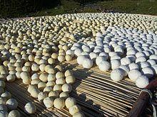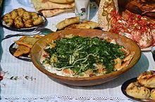 Kashk is a fermented food that is made from grain mixed with sour milk or yogurt, but in modern times is also used for a separate dish of dried buttermilk that can be crumbled and turned into a paste with water.[2] Fermented milk products are affected by numerous factors including the species of milk-producing animal, heat treatment processes for raw milk, fat content of milk, fermentation temperature, and inoculation percentage.[3] Drying allows a longer shelf life for the product.[4] This coarse powder can be used to thicken soups and stews and improve their flavor, or as an ingredient in various meat, rice or vegetable dishes such as the Persian eggplant dish kashk e bademjan.[5][6]