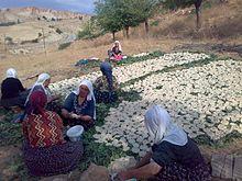 In Turkey, kashk is a dried yoghurt product also known as keş peyniri, kurut, taş yoğurt, kuru yoğurt, or katık keşi.[20] Its contents and production vary by region. In western and northern Turkey, especially in Bolu, the product is categorized as a cheese owing to its shape and white color. In eastern Turkey, especially Erzincan, Erzurum, and Kars, kurut is produced from skimmed yoghurt made from the whey left over from production of butter by the yayık method,[21] and then crushed or rolled. In parts of southeastern Turkey with a significant Kurdish population, it is called keşk. All versions of this dairy product are salty. It is used as an ingredient in soups, keşkek, erişte, etc.