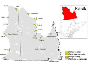 The Kativik Regional Government (French: Administration régionale Kativik, KGR) encompasses most of the Nunavik region of Quebec. Nunavik is the northern half of the Nord-du-Québec administrative region and includes all the territory north of the 55th parallel. The administrative capital is Kuujjuaq, on the Koksoak River, about 50 kilometres inland from the southern end of the Ungava Bay.