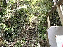 The Scenic Railway is an incline railway now used for tourism. The steepest section of track is on an incline of 52 degrees (128% gradient) contained within a total distance of 310 metres (1,020 ft).[1] It was originally constructed for a coal and oil shale mining operation in the Jamison Valley in the 1880s, in order to haul the coal and shale from the valley floor up to the escarpment above. From 1928 to 1945 it carried coal during the week and passengers at weekends. The coal mine was closed in 1945 after which it remained as a tourist attraction. The Scenic Railway was temporarily closed on 13 January 2013 (although the Skyway, Cableway, and Walkway remained open) as construction to upgrade both tracks and carriages began. The work was completed and the railway reopened in April 2013.[2] The Scenic Railway makes many claims to be the steepest passenger railway, the steepest funicular, and the steepest incline in the world. However the railway uses a winch system[1] and no counterbalancing carriage, therefore it is an inclined lift rather than a funicular.[3] As of 2017 the steepest true funicular is the Stoosbahn in Switzerland.[4]