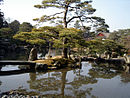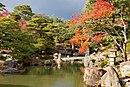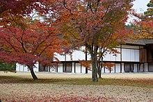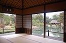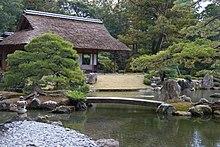 Villa incorporates many traditional Japanese ideas. One example of Katsura's use of traditional ideas is its use of raised floors with tatami mats covering them. Tatami are mats approximately 3 feet by 6 feet in length that are not only used as the floors of the villa, but are also used to define the dimensions of each individual room and the house as a whole.[2][3][4] At Katsura, the mats are used to create the sprawling and pinwheel-like plan that it has today. The terraces and porches created by the arrangement of the tatami mats provide opportunities to view the landscape and link interior spaces with the outside world.[4] The floors of each building of the site are also raised as well, which originally was derived from vernacular designs for granaries, as well as early imperial palaces. They serve the purpose of both keeping the floor dry while also giving hierarchy to the space.[4] Another classic characteristic that the Katsura Imperial Villa utilizes is the use of screen walls (the shōji and the fusuma). In traditional Japanese Architecture, the shoji and the fusuma are used to separate the spaces created by the tatami mat into the various rooms of the house. The shoji is the generic term for the white and translucent screen door or wall that is reinforced with wooden lattice and can either be stationary, hanging, or sliding.[5][6] The fusuma is a subcategory of the shoji and it is the white or painted moving screen partition used on the interior of the house.[7][8] By moving the fusuma, when in conjunction with a stationary shoji, the resident is able to create new rooms within the architecture. For instance by moving one fusuma wall, one could transform two rooms into one large room and a small storage closet. In the Katsura Imperial Villa, the fusuma allows the rooms to change and open up to the natural world with exterior decks becoming extensions of the interior and framing views of the landscape. An example of this type of transformation is the moon viewing platform connected to the Old Shoin.[9] Besides these characteristics, there are many traditional Japanese ideas that are used in the Katsura Imperial Villa, like the decorative alcove (tokonoma), built-in desk (tsukeshoin) and square posts.[8]
