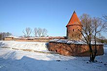 Kaunas Castle is a medieval castle in Kaunas, the second-largest city in Lithuania. Archeological evidence suggests that it was originally built during the mid-14th century, in the Gothic style. Its site is strategic – a rise on the banks of the Nemunas River near its confluence with the Neris River. At the beginning of the 21st century, about one-third of the castle was still standing.