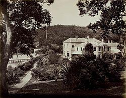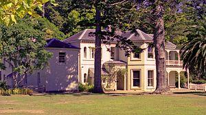 Copper was mined on the island after discovery in the 1842, in the first years of European ownership.[5] With imported miners and their families from Wales and Cornwall, the mining settlement finally reached a maximum of around 300 people, before problems with shipping and mine flooding (despite the construction of a pump house) closed the mine again in 1855.[2] In 1844/45 the island produced about 7,000 pounds of copper which was about a third of Auckland's exports for that year. The island was bought a few years later by Sir George Grey, Governor of New Zealand, in 1862 as a private retreat. Grey extended the original copper mine manager's house (built 1845) to create the Mansion House, which still stands, and made the surrounding land into a botanical and zoological park, importing many plants and animals.[2] The house changed hands several times after Grey, and decayed increasingly, but has been restored and furnished to its state in the period of Governor Grey and is now in public ownership in the Kawau Island Historic Reserve, administered by the New Zealand Department of Conservation.[2] The reserve is public land and covers 10% of the Island, and includes the old copper mine, believed to be the site of New Zealand's first underground metalliferous mining venture (1844).[3][6][7] The ruins of the mine's pumphouse are registered as a Category I heritage structure.[8]